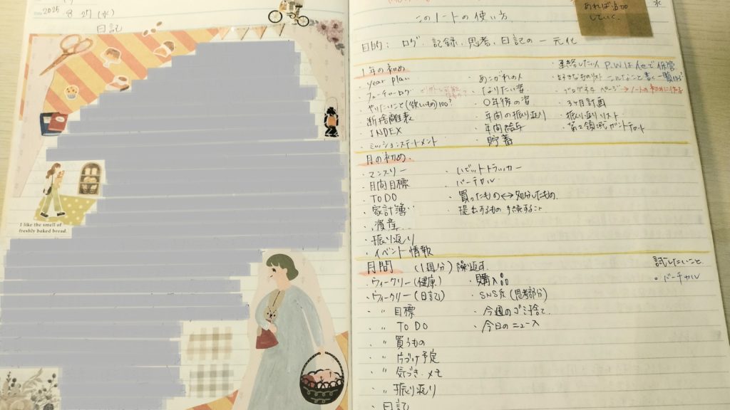 欲張りなので読書記録や学びや気づき、家計簿やライフログなども、たいていのことは1冊に時系列で書いています。
