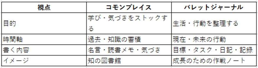 私が感じるコモンプレイスとバレットジャーナルの違いを表にしてみました。